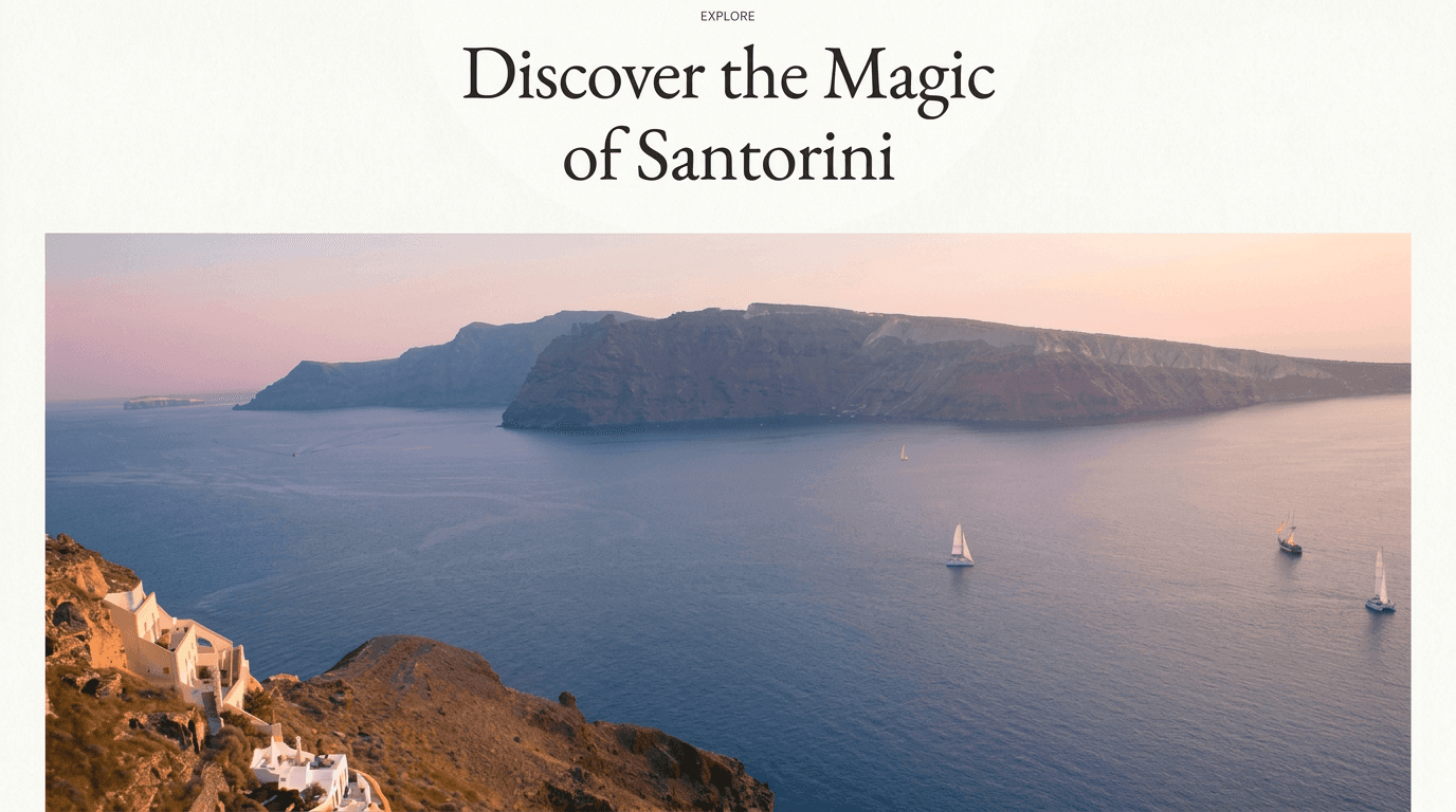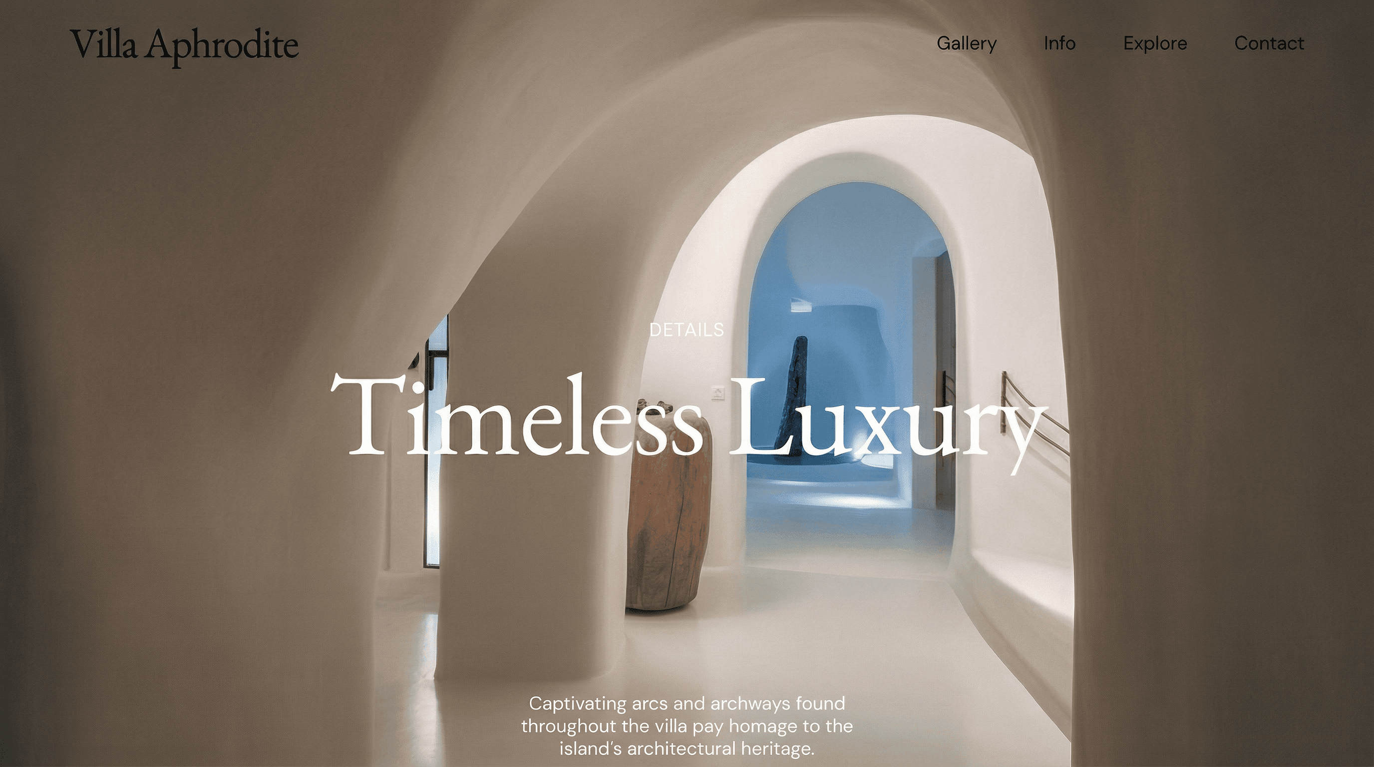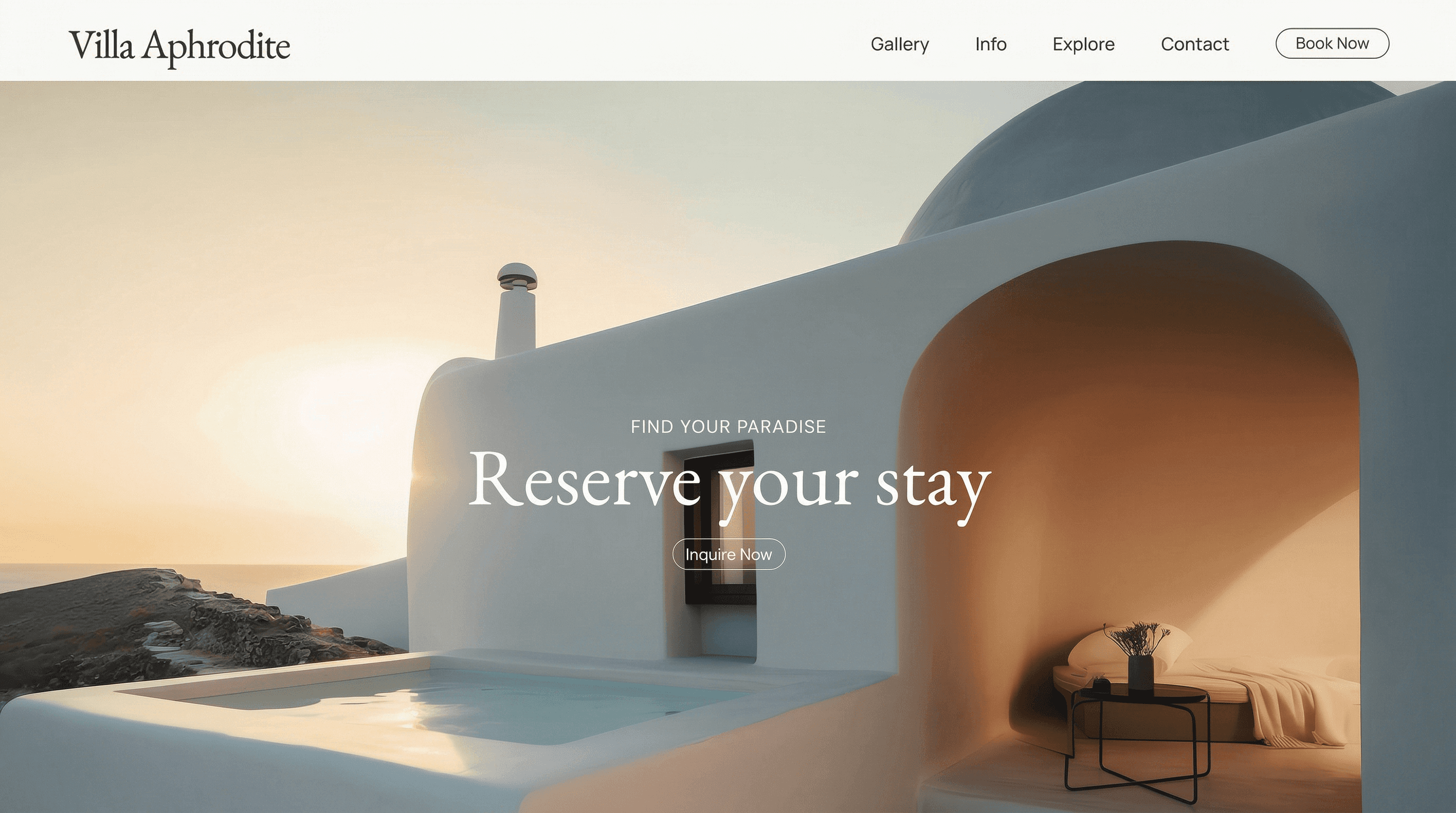 An elegant website designed for luxury vacation rentals, boutique hotels, and premium hospitality experiences. Featuring immersive full-screen imagery, sophisticated serif typography, and seamless booking integration, this design captures the essence of refined Mediterranean living and transforms browsing into desire.